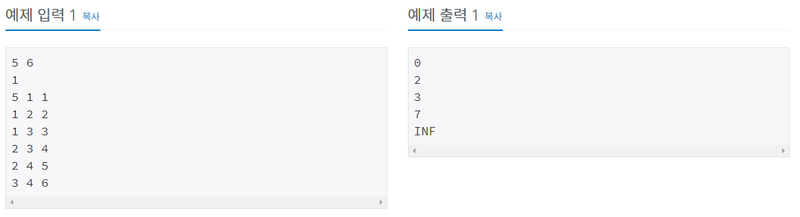 첫째 줄에 정점의 개수 V와 간선의 개수 E가 주어진다. (1 ≤ V ≤ 20,000, 1 ≤ E ≤ 300,000) 모든 정점에는 1부터 V까지 번호가 매겨져 있다고 가정한다. 둘째 줄에는 시작 정점의 번호 K(1 ≤ K ≤ V)가
