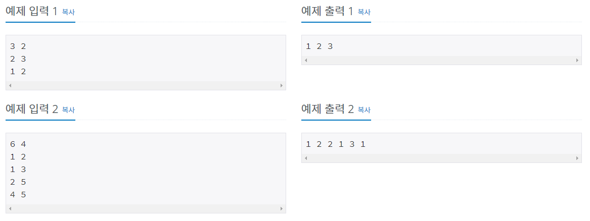 첫 번째 줄에 과목의 수 N(1≤N≤1000)과 선수 조건의 수 M(0≤M≤500000)이 주어진다. 선수과목 조건은 M개의 줄에 걸쳐 한 줄에 정수 A B 형태로 주어진다. A번 과목이 B번 과목의 선수과목이다. A<B인 입력만 주어진다. (1≤A<B≤N)