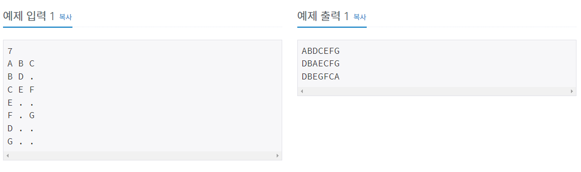 첫째 줄에는 이진 트리의 노드의 개수 N(1 ≤ N ≤ 26)이 주어진다. 둘째 줄부터 N개의 줄에 걸쳐 각 노드와 그의 왼쪽 자식 노드, 오른쪽 자식 노드가 주어진다. 노드의 이름은 A부터 차례대로 알파벳 대문자로 매겨지며, 항상 A가 루트 노드가 된다. 자식 노드가 없는 경우에는 .으로 표현한다.