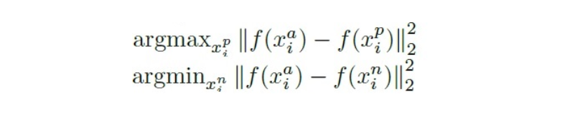 - 이를 해결하기 위해 거리가 최대한 먼 positive (hard positive), 거리가 최대한 가까운 negative (hard negative)를 골라 위의 식을 만족하지 않는 triplet을 만들어야 한다.