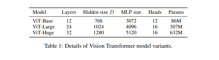 - ViT 모델은 BERT에 사용되는 구성을 기반으로 하였으며, Base와 Large model은 BERT에서 그대로 차용했고 Huge 모델은 저자들이 추가했다.
