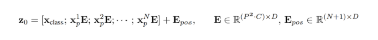 - Transformer의 Encoder의 입력에 해당하는 부분이다. Xclass는 class token, Xp는 각각의 이미지 패치들, E는 linear projection의 가중치라서 XpE는 patch embedding이다. Epos는 positional embedding이다.