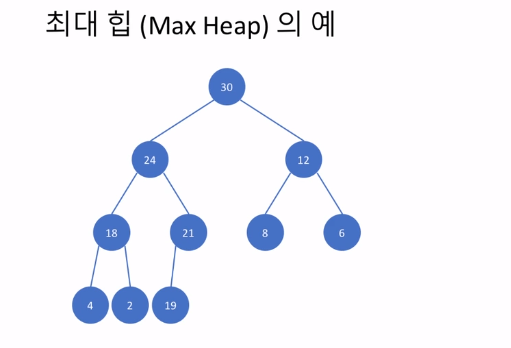 - 최대 힙 (max heap), 최소 힙 (min heap)