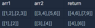 행렬의 덧셈은 행과 열의 크기가 같은 두 행렬의 같은 행, 같은 열의 값을 서로 더한 결과가 됩니다. 2개의 행렬 arr1과 arr2를 입력받아, 행렬 덧셈의 결과를 반환하는 함수, solution을 완성해주세요