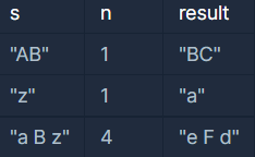 어떤 문장의 각 알파벳을 일정한 거리만큼 밀어서 다른 알파벳으로 바꾸는 암호화 방식을 시저 암호라고 합니다. 예를 들어 "AB"는 1만큼 밀면 "BC"가 되고, 3만큼 밀면 "DE"가 됩니다. "z"는 1만큼 밀