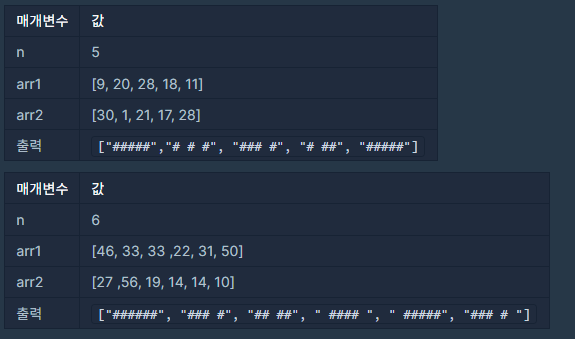 입력으로 지도의 한 변 크기 n 과 2개의 정수 배열 arr1, arr2가 들어온다.
