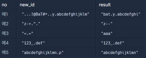신규 유저가 입력한 아이디를 나타내는 new_id가 매개변수로 주어질 때, "네오"가 설계한 7단계의 처리 과정을 거친 후의 추천 아이디를 return 하도록 solution 함수를 완성해 주세요.