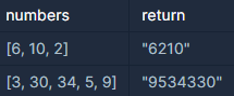 0 또는 양의 정수가 주어졌을 때, 정수를 이어 붙여 만들 수 있는 가장 큰 수를 알아내 주세요. 예를 들어, 주어진 정수가 [6, 10, 2]라면 [6102, 6210, 1062, 1026, 2610, 2106]를 만들 수 있고, 이중 가장 큰