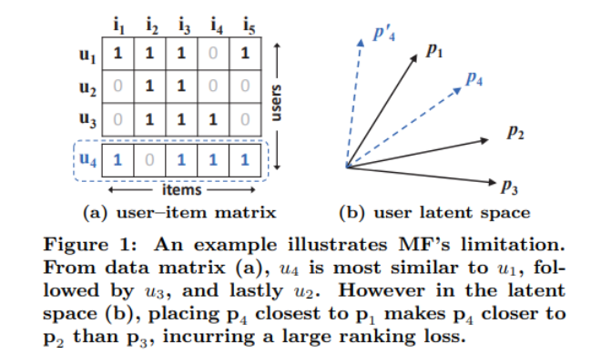 - Figure 1은 MF에서 내적 함수의 제한된 표현력의 문제점을 보여준다.