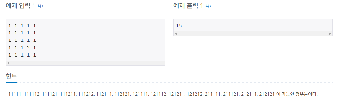 5×5 크기의 숫자판이 있다. 각각의 칸에는 숫자(digit, 0부터 9까지)가 적혀 있다. 이 숫자판의 임의의 위치에서 시작해서, 인접해 있는 네 방향으로 다섯 번 이동하면서, 각 칸에 적혀있는 숫자를 차례로 붙이면 6자리의 수가 된다. 이동을 할 때에는 한 번 거쳤던 칸을 다시 거쳐도 되며, 0으로 시작하는 000123과 같은 수로 만들 수 있다.